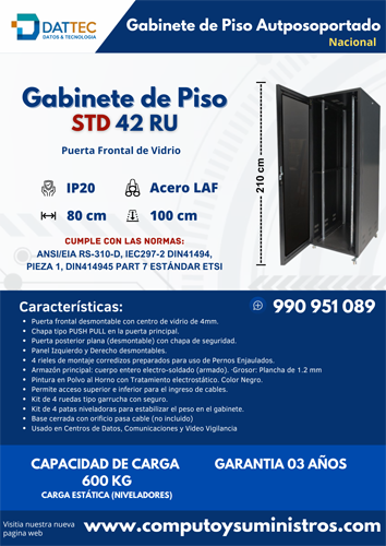 El Gabinete de 42RU 2.10x80x100cm para servidores está fabricado según las normativas de la industria de telecomunicaciones , son ideales para uso en empresas, centros de datos, servidores de red y otras instalaciones de telecomunicaciones y variedad de equipos como Routers, Switch, UPS, Patch Panel, Ordenadores de Cables, Power Rack. Brindándole la oportunidad de realizar instalaciones profesionales.